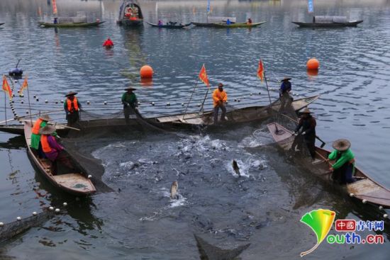 新安江两岸渔民正在进行“九姓捕鱼”表演。 资料图