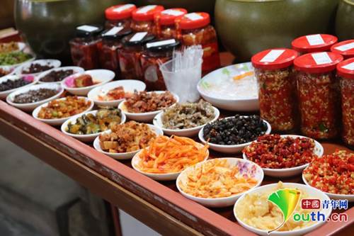 屯溪老街店铺中展示的二十几种“酱料”。中国青年网记者 宋莉摄