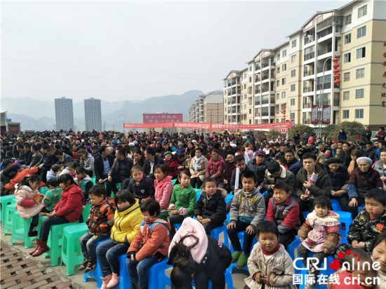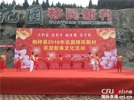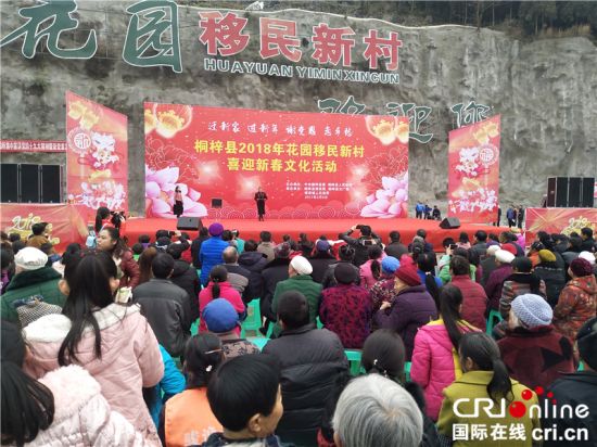国际在线消息(记者 令狐少萍):中国贵州省桐梓县9日举行了2018“迁新家、过新年、谢党恩、恋乡愁”花园移民新村迎新春文化活动。5000多名居于花园移民新村、蟠龙、楚米、桐楚大道4个易地扶贫搬迁安置点的搬迁群众与当地居民、党员干部一起吃汤圆、贴春联、看演出,共同迎接新春佳节。