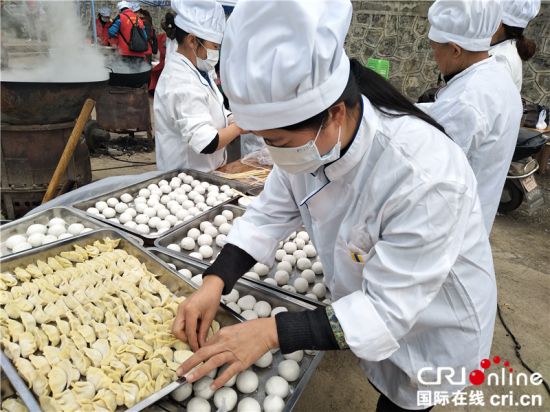 活动现场志愿者为大家抬上煮好的汤圆
