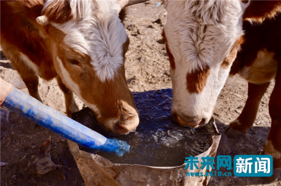 进到院子里面,刘宝开始放水饮牛,在草场呆了一天的牛见到水显得非常迫不及待。未来网记者刘璐摄。