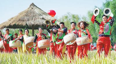 23日,河南省原阳县太平镇水牛赵村农民在稻田间擂鼓起舞,庆祝自己的节日。