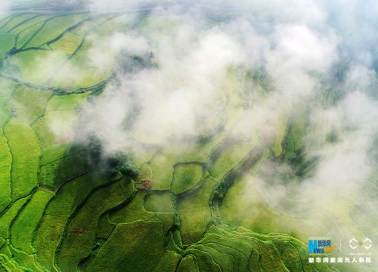 图为9月2日航拍重庆花田乡梯田晨雾美景,万亩梯田晨雾里,宜人秋色奔眼前。新华网发(陈碧生 摄)