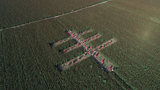 河北阜城县高粱喜获丰收(8月28日无人机拍摄)。新华网发(苗凤强 摄)