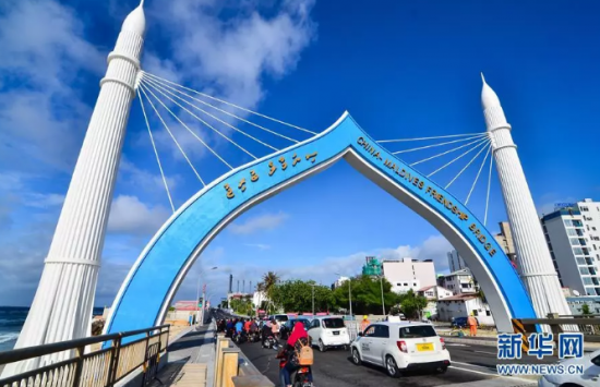 2018年10月2日,车辆从由中国援建、连接马尔代夫首都马累和机场岛的中马友谊大桥桥头拱门穿过。新华社发(杜才良 摄)