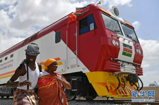 2017年1月11日,在肯尼亚蒙巴萨,当地民众在中国承制的蒙内铁路首批内燃机车旁载歌载舞。新华社记者孙瑞博摄