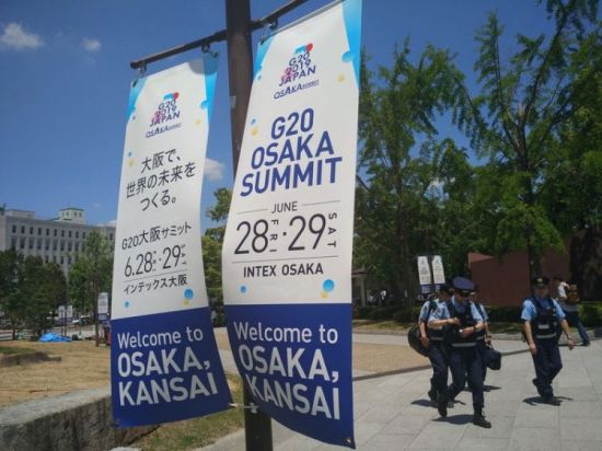 入夏的大阪,骄阳灿烂,绿意葱笼,海风轻拂路人。随着峰会临近,在大阪主要景区、酒店、商厦及干道,均可以看到带有二十国集团领导人大阪峰会元素的标牌、海报和条幅。