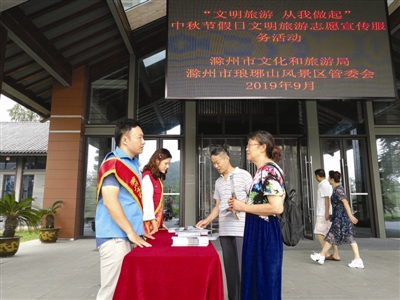 滁州网讯 为深入推进文明旅游体系建设,今年中秋节期间,市文化和旅游局及琅琊山管委会等单位积极组织志愿者开展文明旅游宣传教育,引导市民、游客文明旅游。
