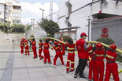 图为孩子们架起水带体验灭火救援。黄丽君摄