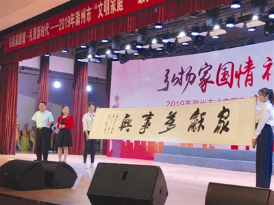 滁州网讯 昨天下午,由市文明办、市妇联主办的2019年滁州市“文明家庭”“最美家庭”先进事迹发布暨“文明家庭祝福祖国”活动举行。本次活动的主题是“弘扬家国情·礼赞新时代”,来自社会各界近800人参加,众多网友同步观看了网络直播。