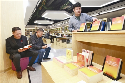 11月17日,新华书店99广场店,市民们在阅读十九届四中全会精神学习辅导读本。11月15日,《〈中共中央关于坚持和完善中国特色社会主义制度、推进国家治理体系和治理能力现代化若干重大问题的决定〉辅导读本》在我市上架。该辅导读本共收录理论文章40余篇,为广大党员干部、群众深入学习贯彻党的十九届四中全会精神,提供了最权威、最全面、最准确的辅导材料。