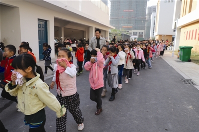 当天,随着“应急警报”铃声响起,演练正式开始。各班班主任及各楼层值日老师迅速到岗,组织学生快速有序撤离。孩子们纷纷弯腰,用小手绢、纸巾或手捂着鼻子,沿着学校指定楼梯口快速疏散,有序撤离到学校操场。