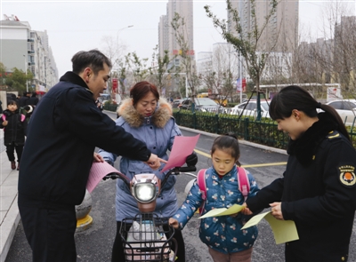 1月8日,南谯区龙蟠社管中心、区城管局等多家单位志愿者在龙蟠小学门口为学生和家长宣传讲解《南谯区城区禁止燃放烟花爆竹告知书》。