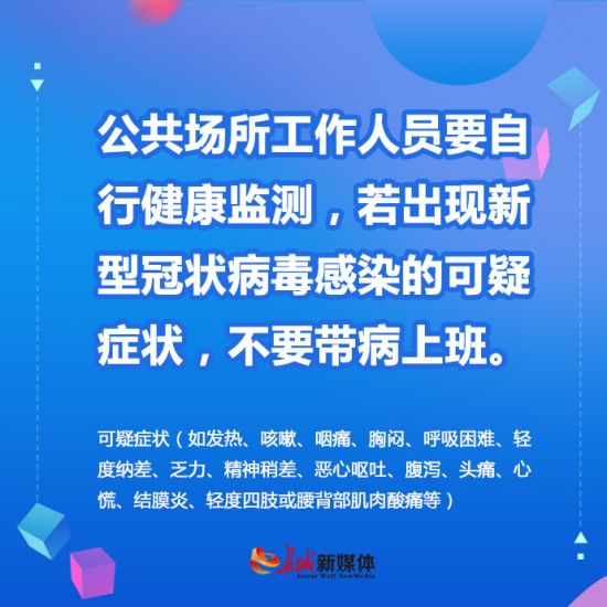 一、公共场所工作人员要自行健康监测,若出现新型冠状病毒感染的可疑症状(如发热、咳嗽、咽痛、胸闷、呼吸困难、轻度纳差、乏力、精神稍差、恶心呕吐、腹泻、头痛、心慌、结膜炎、轻度四肢或腰背部肌肉酸痛等),不要带病上班。
