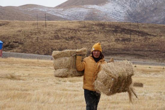 在青海省果洛藏族自治州甘德县江千乡,牧民华吾正在搬运饲草。(2020年11月3日摄)。新华社记者解统强 摄